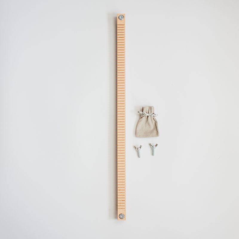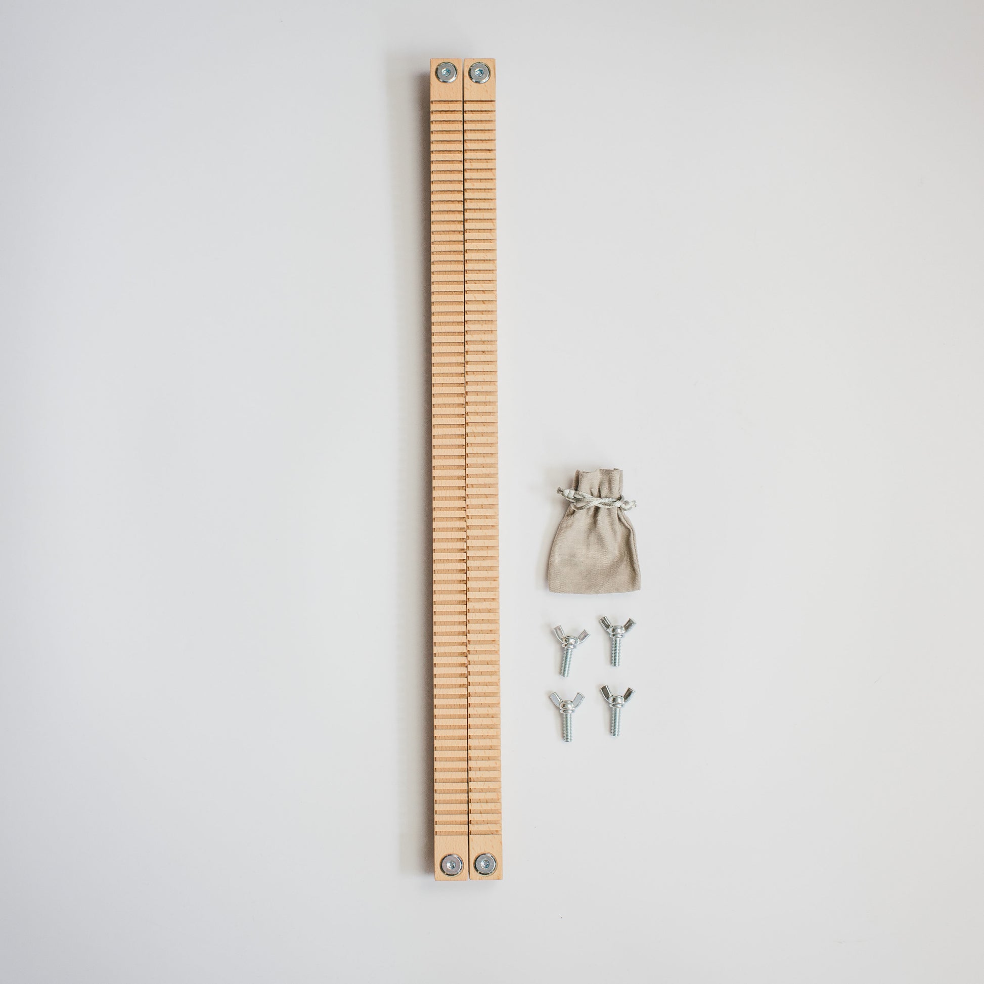 The Double-Sided Heddle Bar is the first of its kind on the frame loom market and was conceived to help hand-weavers maximise their design capabilities when weaving on a frame loom. When adding our Double-Sided Heddle Bar to The Oxford Frame Loom it acts like an extra beam on a table or floor loom.