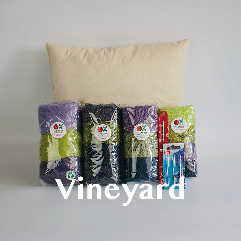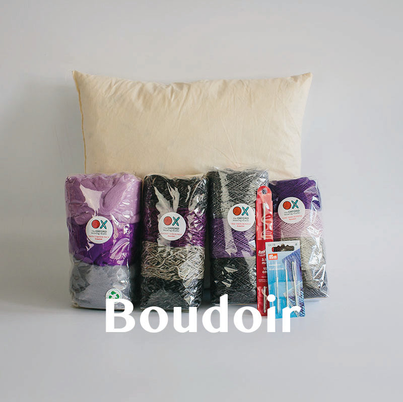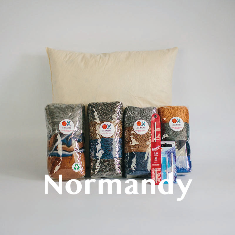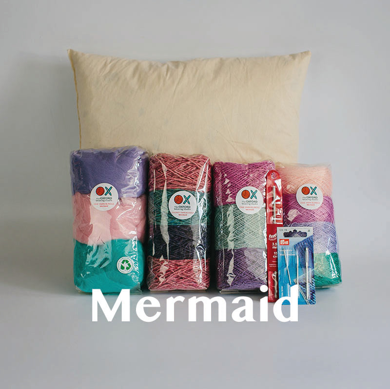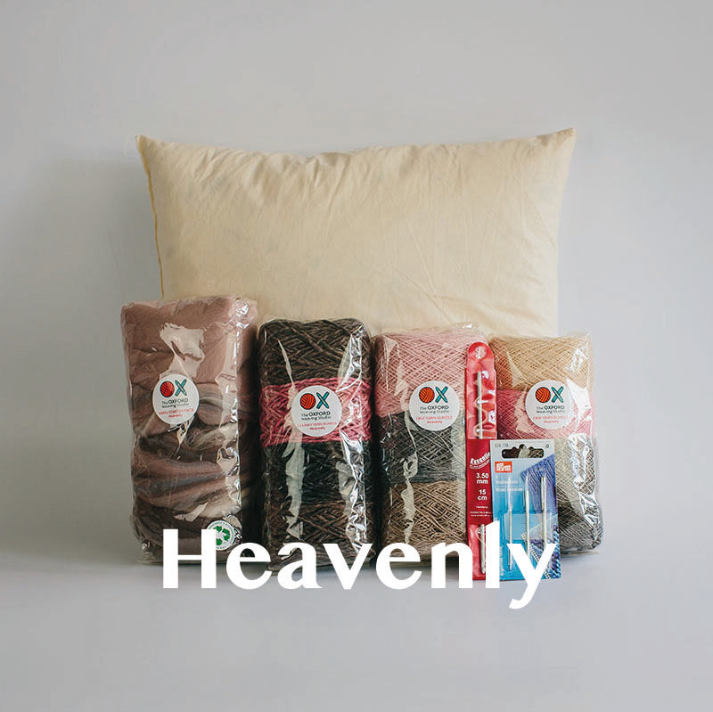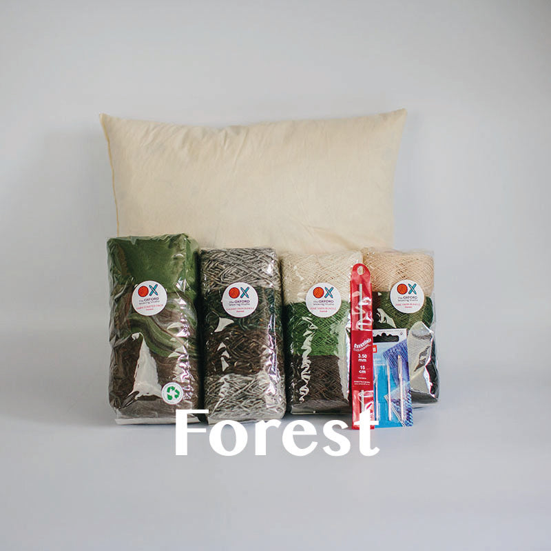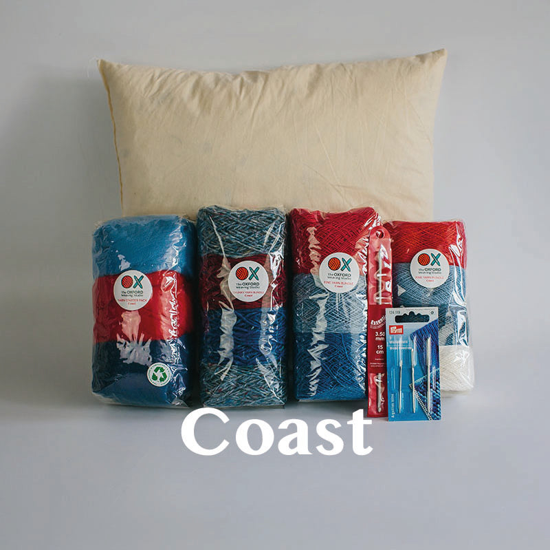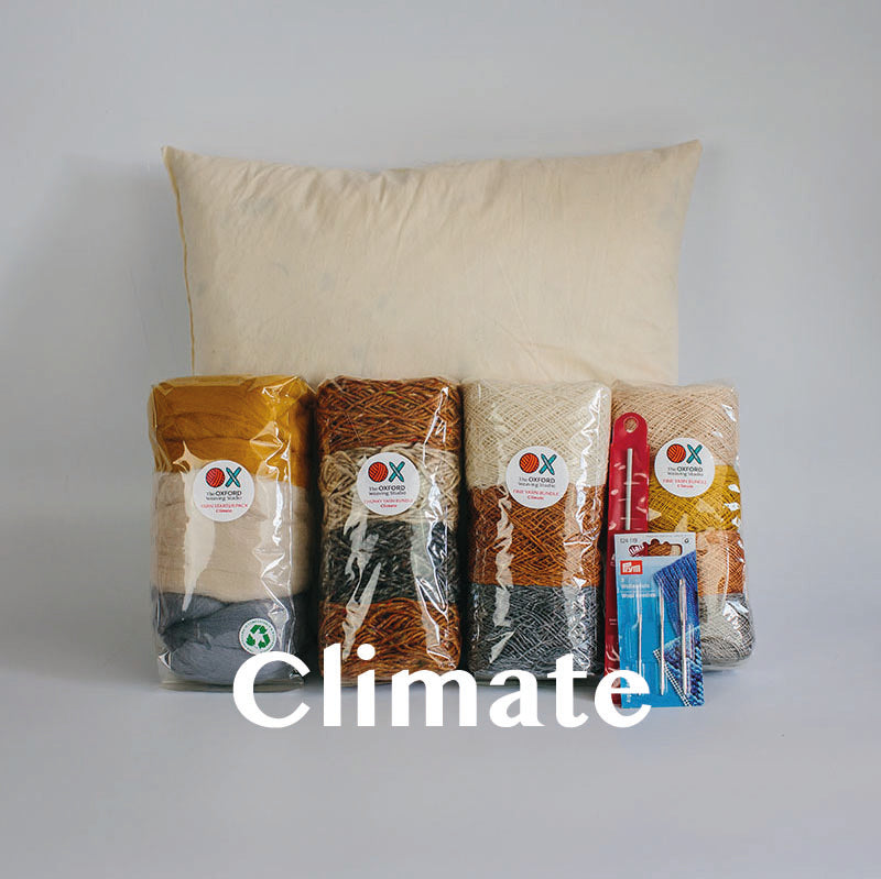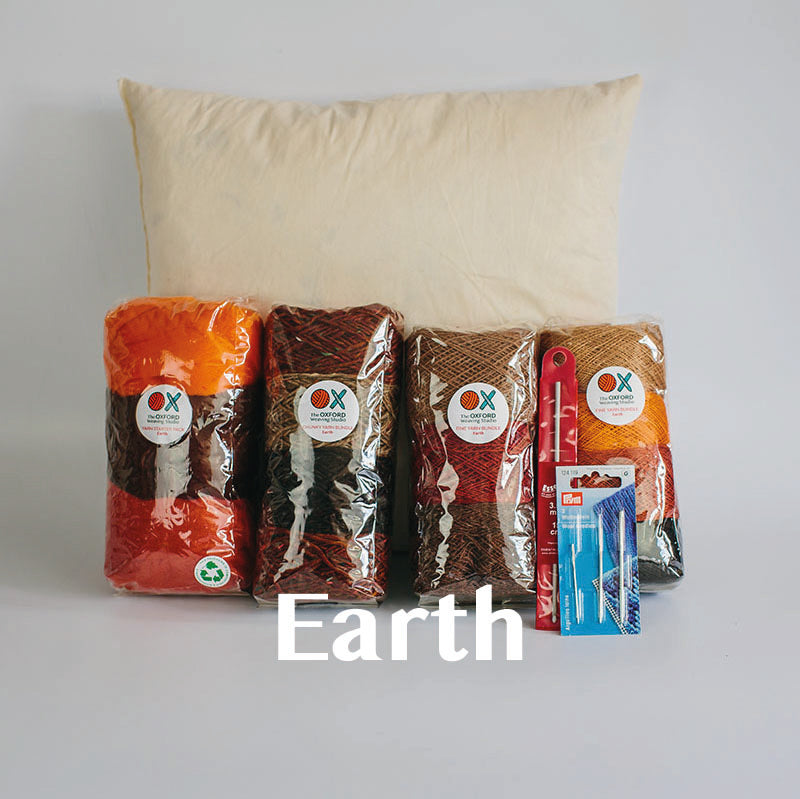 Our new Contemporary Cushion Starter Bundle has everything you need to design, weave and sew a beautiful cushion. It features a total of 350g of yarn across 4 bundles in different colours, qualities and thicknesses, a set of 3 tapestry needles, a crochet hook suitable for tucking in ends and a 14in x 14in duck feather cushion pad insert.